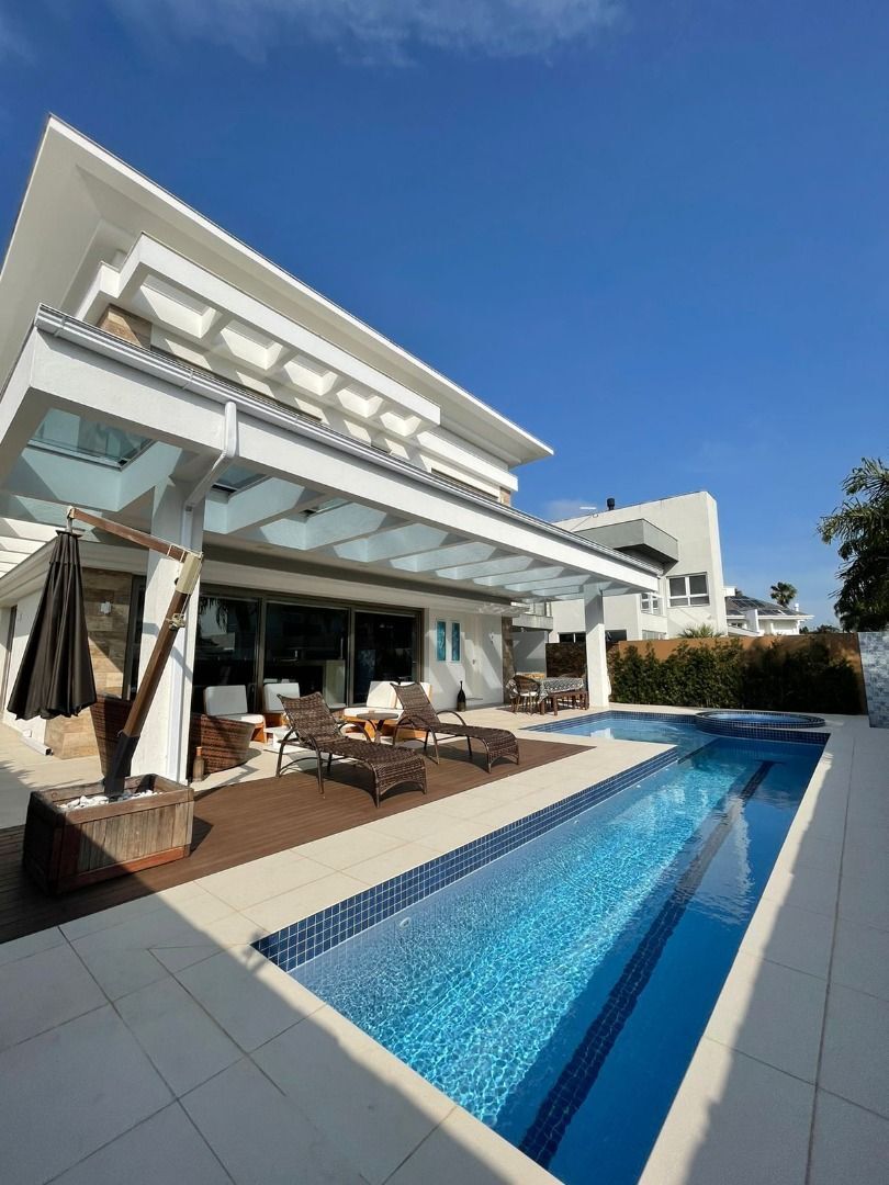 Com linhas retas e fachada imponente, esta casa contemporânea se destaca pelo pé direito duplo que permite entrada de luz natural. A integração da área social é incrível, sala de estar com lareira, sala de Tv, sala de jantar e espaço gourmet completo com churrasqueira e uma ótima opção para receber os amigos. Ela ainda possui uma cozinha separada e toda equipada.Com um grande vão com abertura que proporciona uma vista ampla do interior da casa para a piscina, tendo uma visão privilegiada do por do sol ! Prainha, spa com aquecimento é um convite para curtir bons momentos.Possui suíte térrea com aquecimento, hoje com móveis planejados SCA para um Office. Quatro suítes na parte superior do imóvel, sendo a suíte máster com dois banheiros e closet, estes ambientes possuem aquecimento no piso (hotfloor). Muito bem construída e com suas manutenções estão em dia, os atuais moradores se preocupam em manter o imóvel em ótimas condições. Imóvel*495 m² de área privativa*450 m² de terreno*Estar / TV / Jantar e Espaço Gourmet integrados*Cozinha separada*5 suítes sendo uma térrea e suíte máster com dois banheiros e closet*Garagem para 5 carros*Dependência de empregada*Aquecimento solar*Aquecimento dos pisos dos banheiros das suítes, closet e suíte térrea*Proximidade da praia 500 metros