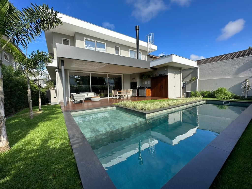 Com linhas retas, arquitetura moderna, esta casa se destaca pela integração dos espaços sociais. Uma agradável área com churrasqueira, piscina e um belo paisagismo ... espaço ideal para receber seus amigos e família. Imóvel:*389 m² área privativa*450 m² de terreno *4 suítes sendo 1 máster com closet e espera para hidromassagem no banheiro*Com pequena intervenção torna-se uma suíte térrea*Sala de estar / jantar e cozinha integrada*Sistema de aquecimento tubo vácuo*Mobiliada com a Eviva e equipada com eletros de qualidade *Porteira fechada